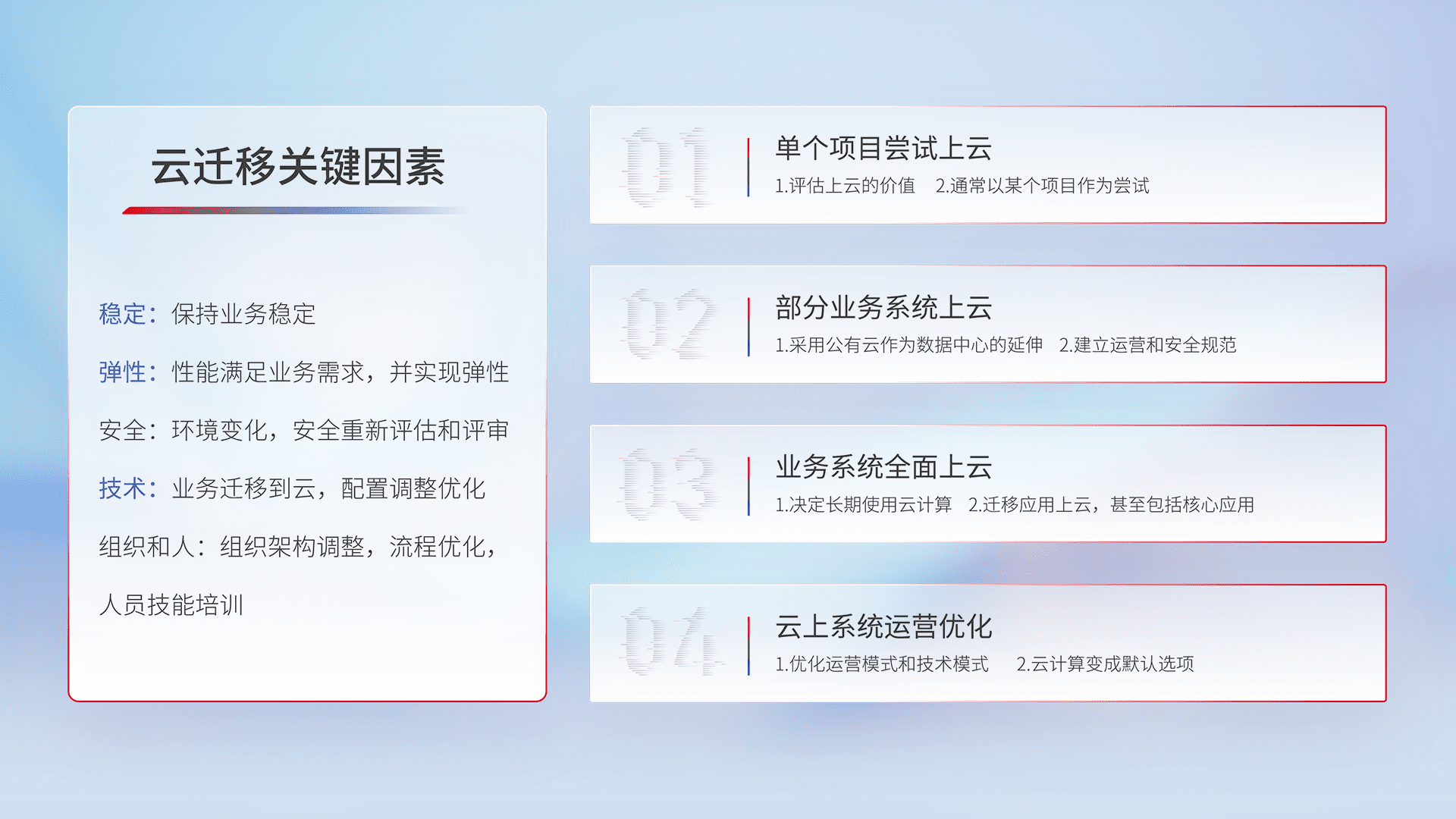 结合实际业务,,,从规划设计、、、、云平台选型、、云原生改造、、、、数据迁移、、、、集成交付,,,迁移全过程为客户识别最佳上云路径,,做好风险识别管理,,,设计网络架构、、身份权限、、安全审计合规、、、、操作审计、、日志审计、、、监控告警策略、、多站点容灾设计等,,,,对云上基础设施进行整体规划,,,提升IT治理水平,,,,以满足弹性、、、高可用、、、高性能的需求。。。