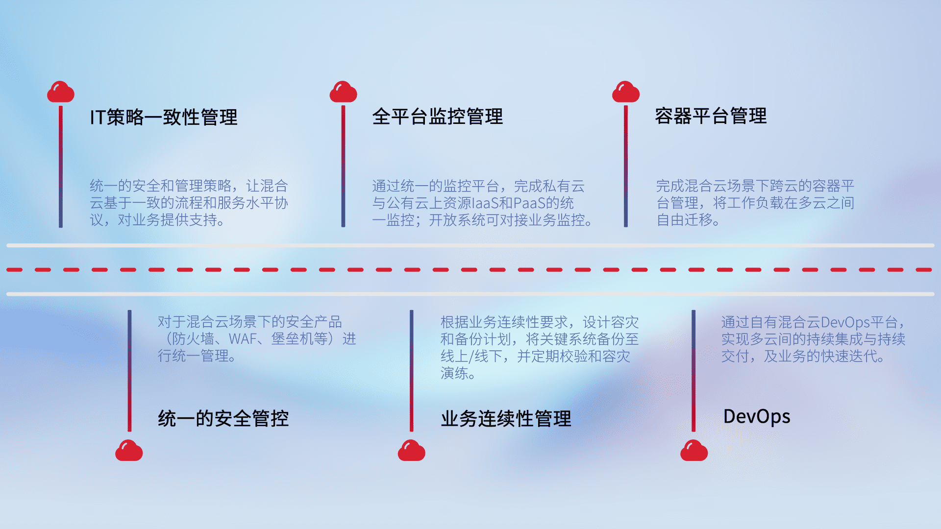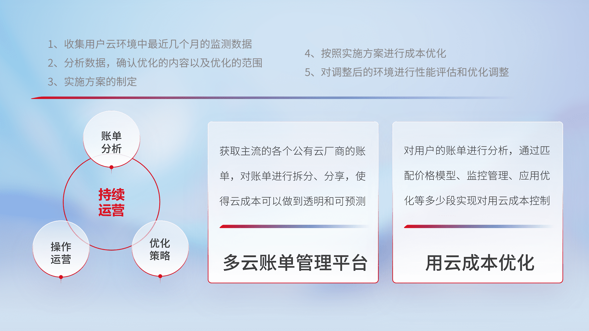 通过多云纳管,,,,以统一的资源数据模型把客户的云资源进行抽象和封装,,,,进而实现对多云资源的统一操作,,,,保障云资源管理的可靠性、、、稳定性与可用性。。量身定制化运维内容,,,配置、、、开发运维、、补丁管理、、、备份、、、监控、、、认证和访问管理、、、、审计和日常巡检等,,,,保障在用云过程中的可靠度,,稳定度以及高可用率。。