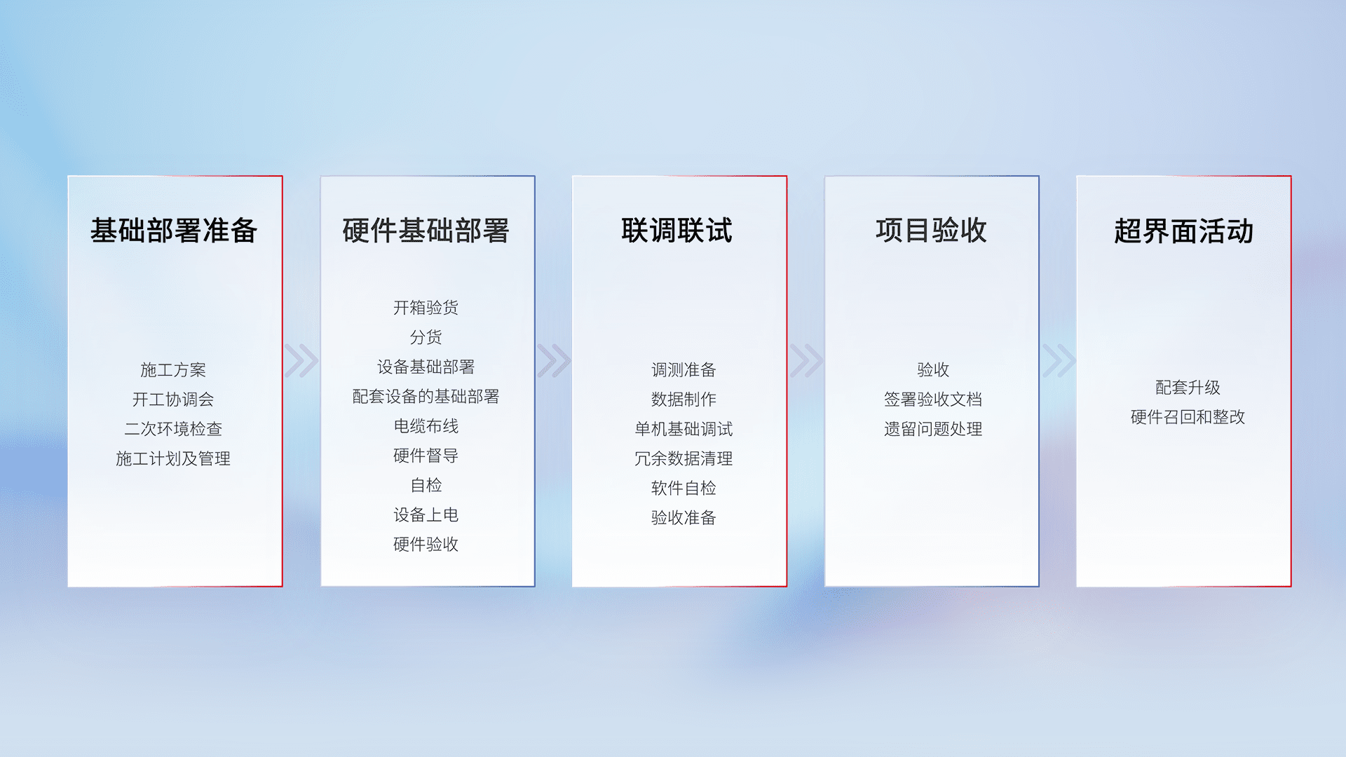 从基础部署准备、、硬件基础部署、、、联调联试、、、项目验收、、、、越界面活动的全过程可追溯,,,,保证施工质量和进度。。。