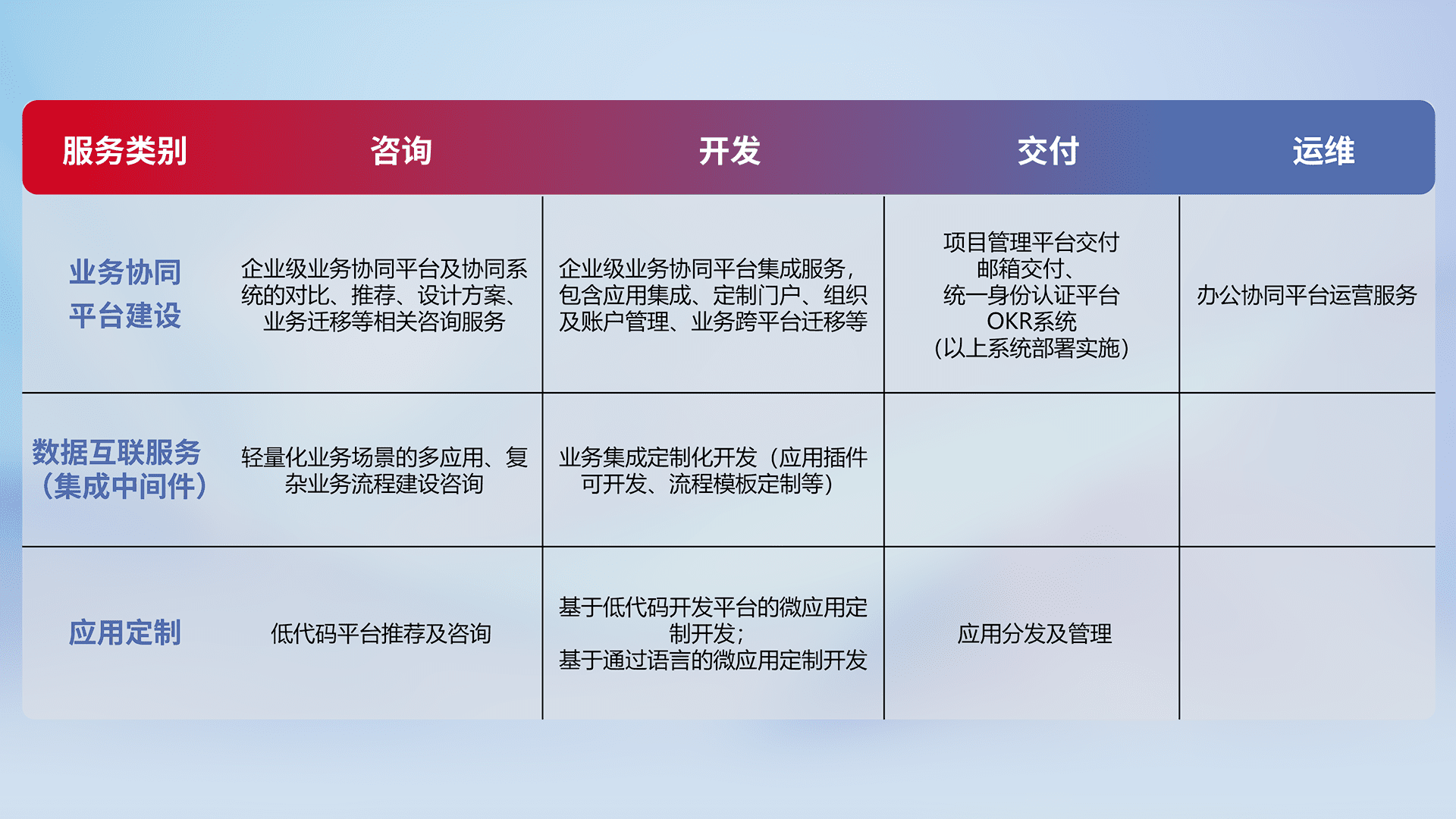 针对钉钉、、企微、、、IDaas等平台级产品提供产品的规划、、、、方案、、、、交付、、、、定制化开发等服务,,,实现如统一协同办公、、智能客户服务、、、混合会议管理、、、智能数据查询、、、等业务场景,,,实现数字化转型。。